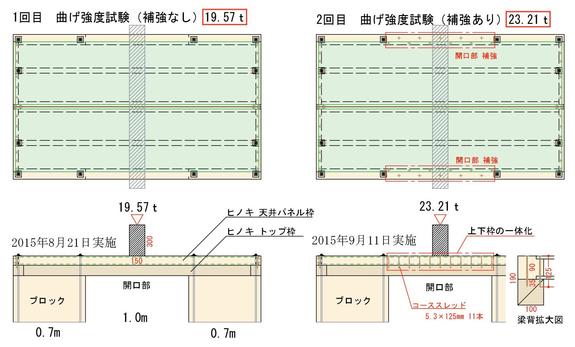 その後、L125㎜のコーススレッド(木ビス)22本で天井パネルとヒノキトップ枠とを一体化する補強によって同じ試験をしたところ23.2tの強度増加の結果を得ることができました。