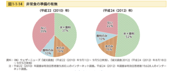 このような中、東日本大震災の前後における非常食の準備の状況をみると、非常食を準備している人の割合は、平成22(2010)年9月の61%(水+食料37%、水のみ14%、食料のみ10%)から、東日本大震災から1年半が経過した平成24(2012)年9月の78%(水+食料52%、水のみ16%、食料のみ10%)まで17ポイント上昇しました