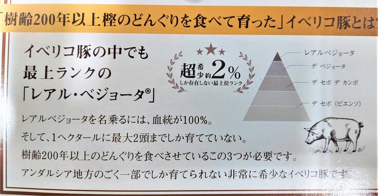 当店で取り扱っている商品は最高級のイベリコ豚です、イベリコ豚といってもランクがあり、当店で取り扱っているのは最高ランクの【レアルベジョータ】というランクになります、このレアルベジョータはイベリコ豚全体の2%しかありません!