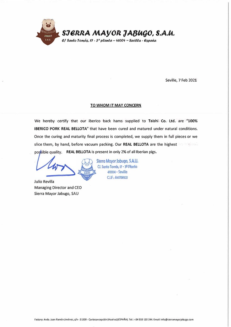 こちらスペインのイベリコ協会からいただいた『レアルベジョータ』の証明書になります。