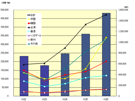 【H22(2010年~) 北海道へくる訪日外国人者数(実人数)の推移】