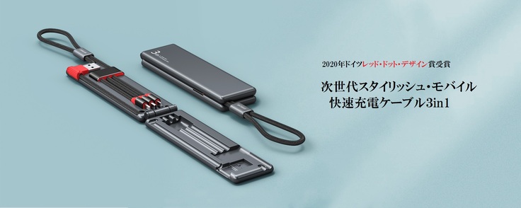 今度弊社が出したMAGIC BOXにはデザイン性及び実用性を両方重視して開発した商品であります。2020年ドイツでレッド・ドット・デザイン賞を受賞しました。僅か58gで急速充電ができ、さらに三つのケーブルでの同時充電が可能となっております。