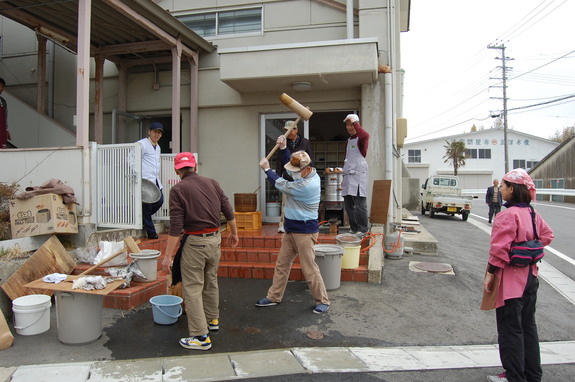 (みんなで楽しく、お餅つき。力自慢があつまりました)
