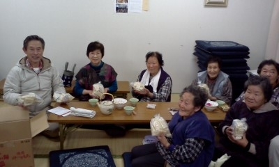(仮設集会場でお餅をうけとり、喜んでくださるみなさん。この笑顔をみると一安心です)