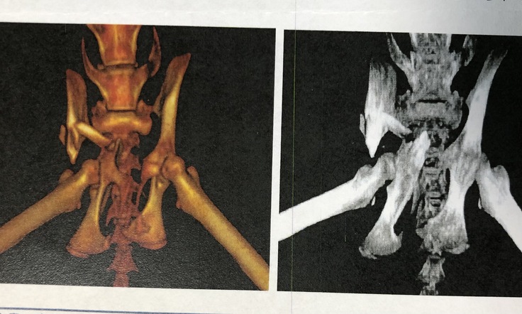 医療センターで改めて骨盤骨折(右腸骨骨折、左恥骨骨折)、左右仙腸関節脱臼と診断されました。後肢は全く動かせない状態で、骨折によって骨盤周辺の臓器を傷つけている可能性もあるため至急手術が必要とのことでした。手術をしても完全に歩けるようになる保証はないこと、合併症のリスク等の説明を受け、手術をお願いしました。