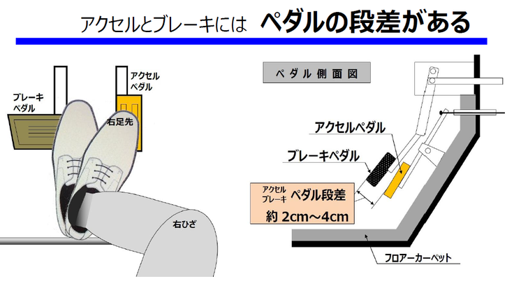 全車種に共通する車両構造ですが、ブレーキペダルとアクセルペダルを同時に踏むのを防止するため、ペダルは上下の段差があります。アクセルペダルよりブレーキペダルが2cm~4cm高く設計されています。ドライバーがブレーキペダルを踏むためには、右足をアクセルから引き上げる縦の動きとアクセルからブレーキの左に移動する横移動の2つ動作を同時に行う必要があります。当社の調査では上下のペダル段差は自動車メーカーによって異なっており、高齢者にとっては段差量の大きさはペダル正確に操作する上で大きなハードルとなっていると考えられます。