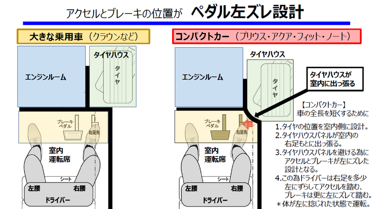 暴走事故の発生車は、コンパクトカー(乗用車)と軽自動車に集中して発生しています。コンパクトカーと軽自動車には構造的な特徴があります。車の全長を短くする構造のため、前輪タイヤ部分の車体フレームが室内側に入り込む設計となっています。車内を見るとアクセルペダルの右側に大きく丸い形状が室内に出っ張っています。これが前輪タイヤの車体フレームです。