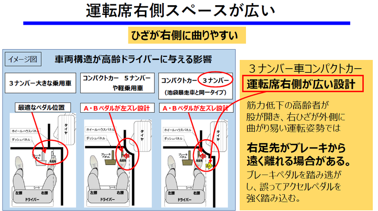 最近、3ナンバーコンパクトカーが多く販売されています。3ナンバーコンパクトカーが居住空間が広くなるため快適な運転が商品力です。この車種の場合、運転席と右側ドアとのスペースが広くなり、高齢ドライバーの運転姿勢が股が開き右ひざが右側に曲がる姿勢が、さらに右側に右ひざが曲がる可能性があり、アクセルペダルを踏む右足が大きくブレーキペダルから離れる可能性があります。従って、筋力低下した高齢ドライバーの場合、右足がブレーキペダルを踏み逃がす可能性が高くなります。