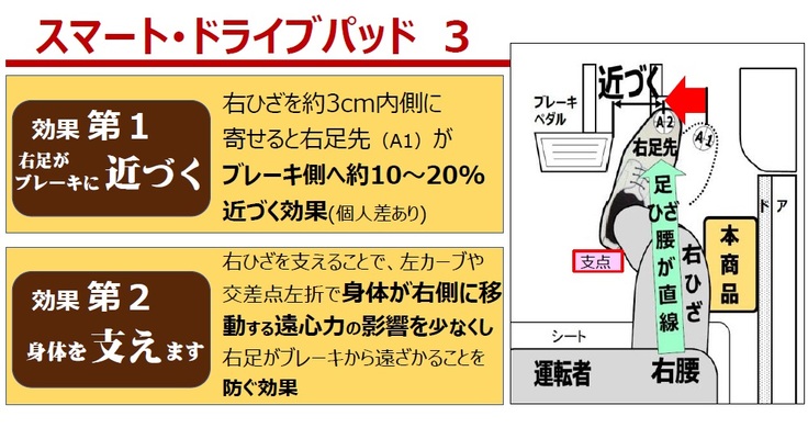 ドライバーの右足を左側に矯正することで、車の構造要因3点を軽減する効果があります。