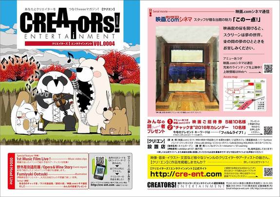 2015年3月に立ち上げたクリエイターズ!エンタテイメントでフリーペーパーを創刊しました。本誌の特徴はイラストレーター、ライター、役者、音楽家など、クリエイターやアーティストの作品をエンターテインメント感覚で楽しめる!という点です。東京都内で活動しているクリエイターは沢山いますが、神奈川県央にもクリエイターがいます。その作品を活動拠点の地元の皆さんに存分に楽しんでもらいたい!それが本誌のコンセプトです。