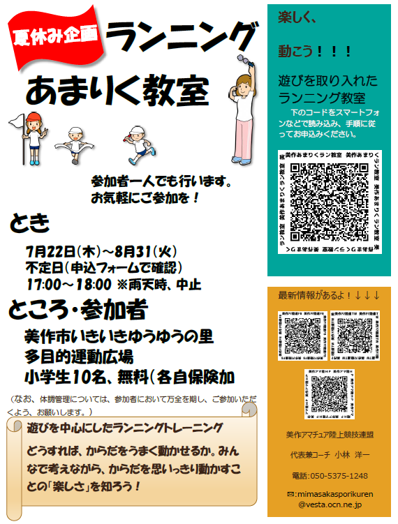 本日から、美作アマチュア陸上競技連盟主催によるランニングあまりく教室(アマチュア陸上)を無料で開催させています。