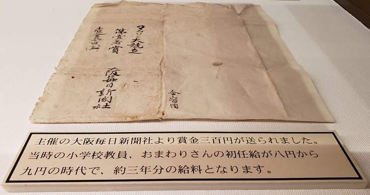 綾木さんに贈られた賞金は300円。いまのお金に換算すると100万円くらい。優勝旗2本のほか、副賞は韋駄天の絵、清酒、椿油、洋皿など、どっさり52点。さらに市中パレード、ホテルでの大祝宴が待っていたそうです。