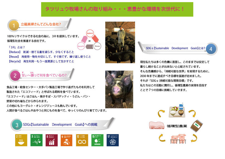 今後の取り組みとしてタツリュウ牧場と畜糞処理でも協力し、堆肥を地域の耕種農家に還元して、生産された野菜や穀物を私どもで買い取り、地域社会と循環型農業へ取り組み、ネオ6次産業を通してパートナーシップでSDGsが目指す豊かで健康な社会に貢献して行きます。
