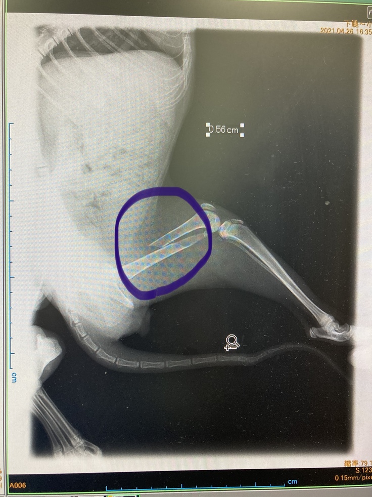 4月24日夜、少し遠目に見えた小さな野良猫ちゃんが餌を求めて居酒屋の外席にいたお客に寄って行くのが見えました。すぐ横は交通量の多い国道。警戒心の強そうな小さな野良猫の動きに嫌な予感がしつつ見ていると、その予感は的中しました。何かの拍子にびっくりして大通りに飛び出してしまい、車も慌てて減速はしましたがタイミング悪く通り過ぎた車の後ろでその場でパニックになり飛び回っている姿(その場から逃げようにも後ろ足片方が折れており、前に進めない状況)を目にし後続の車に轢かれぬよう反射的に保護しました。パニックと野生の本能で噛みつき爪を立て死力をふり絞って威嚇を繰り返し必死に抵抗しましたがこのままでは確実に死んでしまうと思いタオルをかけて無理やりエコバッグに入れタクシーで連れ帰りました。すぐに夜間緊急動物病院へ連れて行き応急措置後、翌日手術対応の出来る病院へ連れて行きました。