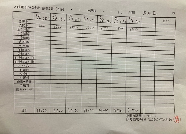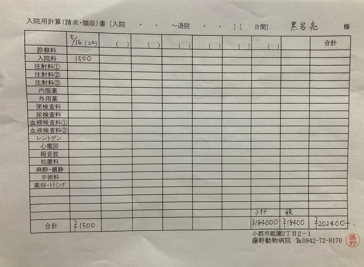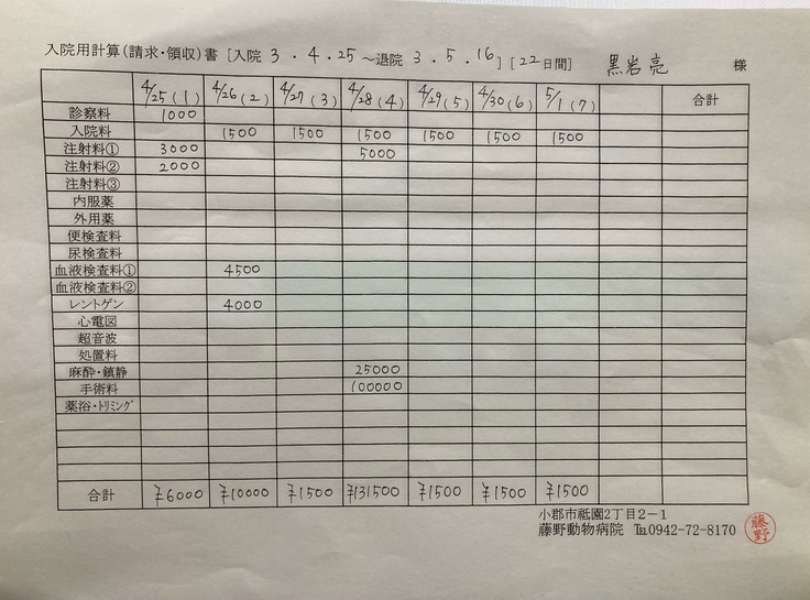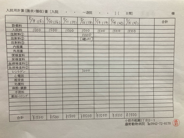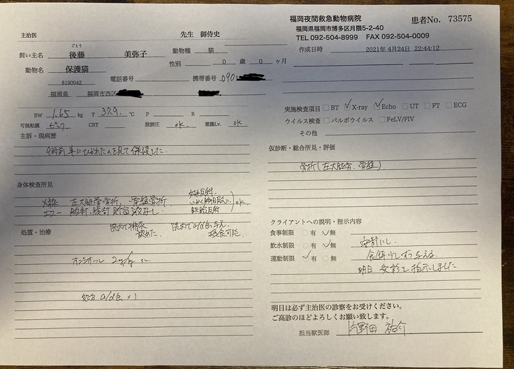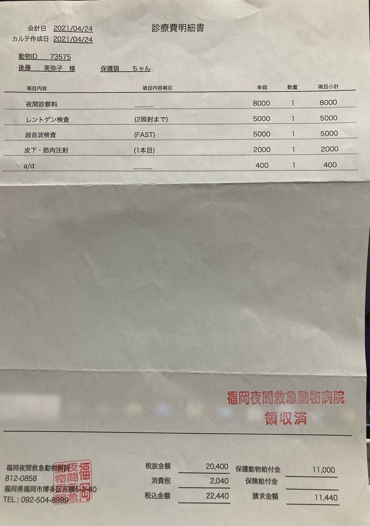 4/24事故直後、唯一診頂いた夜間救急動物病院での診断結果・明細書です。