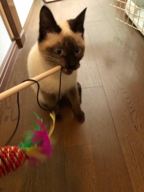 ご覧頂き有難うございます。おもちゃと戯れる様子です。猫らしくなってきて後ろ足の動きもスムーズになってきたようです。里親さんを募集するか迷う程愛着が沸いてきてしまいます。