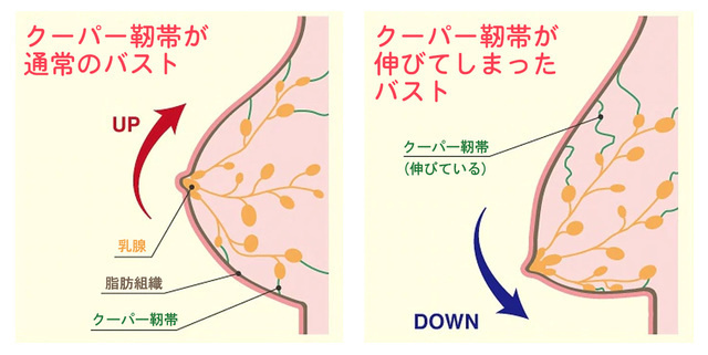 しかし、クーパ-靭帯はとてもデリケート。日常の動きや刺激によって伸びたり切れたりしてしまいます。 しかも一度切れてしまうと、元の状態に戻すことは不可能です。 クーパ-靭帯が伸びればバストも垂れ下がってしまうため、美しいバストを保つには意識すべきポイントとなります。