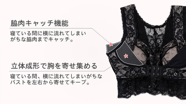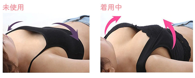寝ている姿勢によって胸は上や横へ流れてしまいます。 例えば、うつぶせ寝をすると、自分の体重が胸へかかるため、胸の形がつぶれた状態で長時間過ごすことになります。 胸自体に圧力がかかればクーパ-靭帯に負担もかかります。 なので、左右や上へ流れる胸を優しくホ-ルドする「ナイト用ブラジャー」の着用がおすすめなのです。