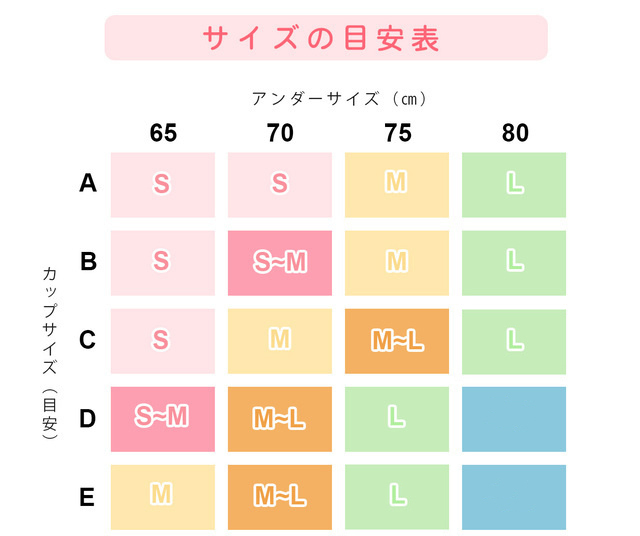 ※サイズの目安表はあくまでも参考用になります。着用感は個人差がございますので、予めご了承ください。ショ-ツサイズはブラと同じサイズになります。