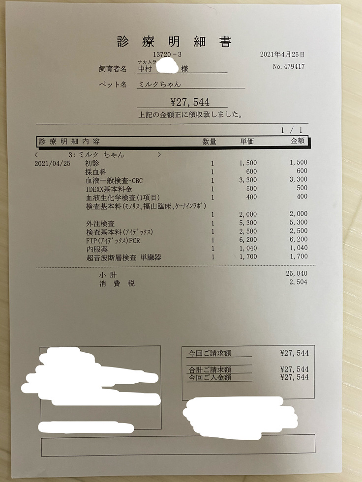 外注検査の結果についてかかりつけの病院から電話がありました。数値を見ると明らかに高くFIP確定と言われました。ミルクはシクロスポリンカプセルでは効果がなかったのですぐに新薬に切り替えました。しかし、助けてあげたくても経済的に継続して投与が出来ないのであれば助けてあげることはできません。それにココアの時にクラウドファンディングに挑戦したくさんの方に応援していただいたのでまたお願いをする訳にはいかないと思いたくさんの葛藤にかられていました。
