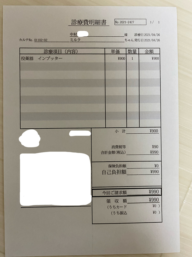 ミルクの体重は現在3㎏で、1回の投薬量は400mgです。