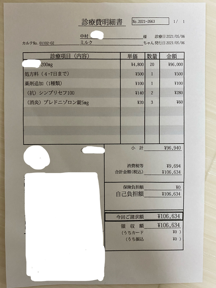 わかるまでには1週間程度かかるため、とりあえず解熱剤を処方してもらいました。検査結果を待っている間にミルクの容態が悪化してはいけないと思い、ココアの時にお世話になっていた協力病院の先生にメールで相談しました。