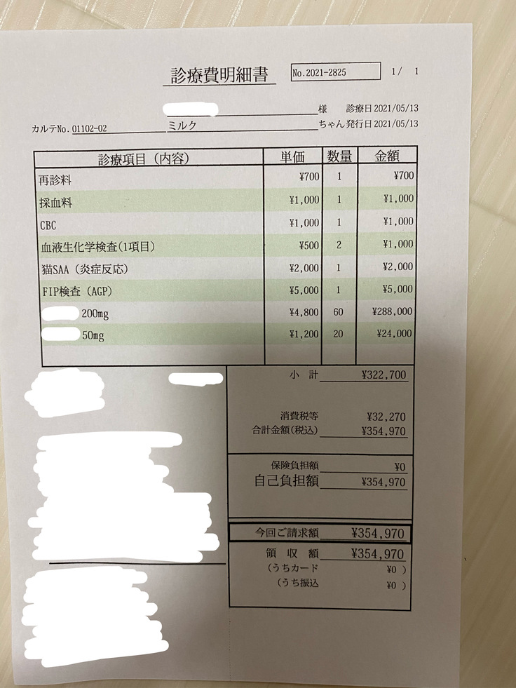 そんな思いで新薬を使った治療をしたいと考えました。(ココアの時に新薬を使った治療をしていたので新薬の存在は存じておりました。)FIPに効果がある新薬は、致死率99%以上のこの病気でも