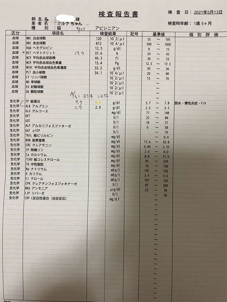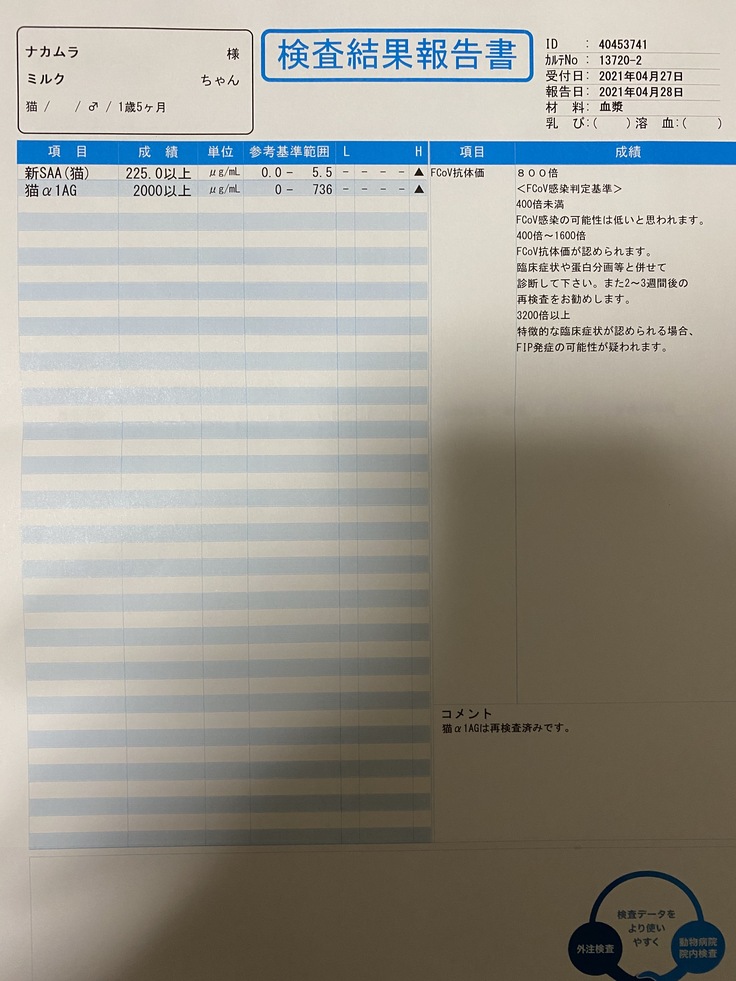 熱が40.4℃あり、血液検査をするとグロブリンの数値が高くA/G比が0.54で低いところからFIP(猫伝染性腹膜炎)の疑いがあるということでFIPの詳しい検査も行いました。しかし、その結果が