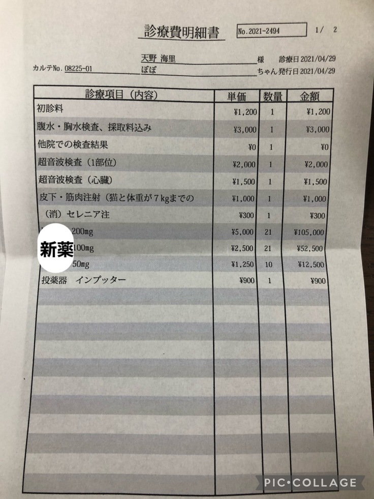 その日すぐにその病院に電話をして、 休みの日に診察と病気の詳しい説明、新薬の処方をしていただきました。 その治療費は薬代、定期検査費等も含めて100万円はかかりますと先生がおっしゃっていました