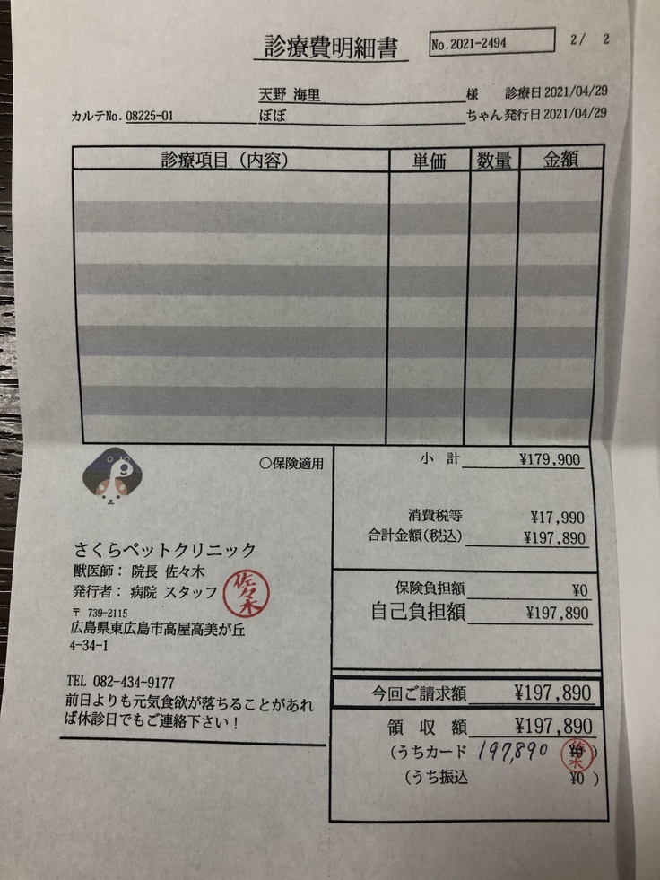 2週目(5/15)、4週目(未定)、10週目検査代(未定)