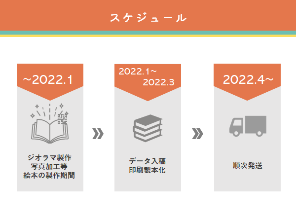 絵本の製作スケジュールに関しましては上記を予定しております。なお、この予定は進捗状況によって大幅に変更する可能性があります。そのことを念頭に置いて、長い目でご支援くださいますと幸いです。