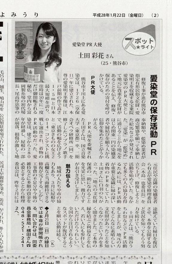 以前にも愛染堂の現状をもっと知ってほしいと応援いただきました愛染堂PR大使土田彩花さん。埼北読売スポットライトにコメントしていだきました。2月21日の愛染堂の縁日では埼玉北部を代表する元気な屋台集団の出店が予定されてますが、更なるサプライズがあるかも。