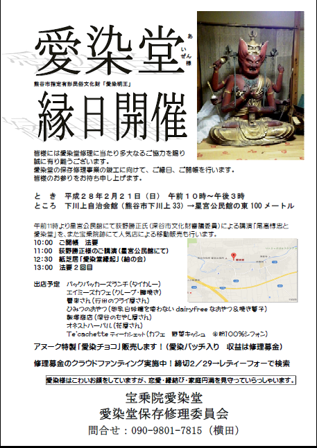 昨年の同時期、愛染堂の縁日は10年振りに復活しました。今年も2/21に行うことになっています。お近くの方は是非足をお運びいただき、愛染堂や愛染明王様の現状を知っていただけますようお願いします。