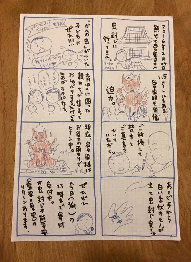 虫封じに参加したアーティスト唐崎瑞穂さんからこんな素敵な漫画を書いて協力していただいてます。