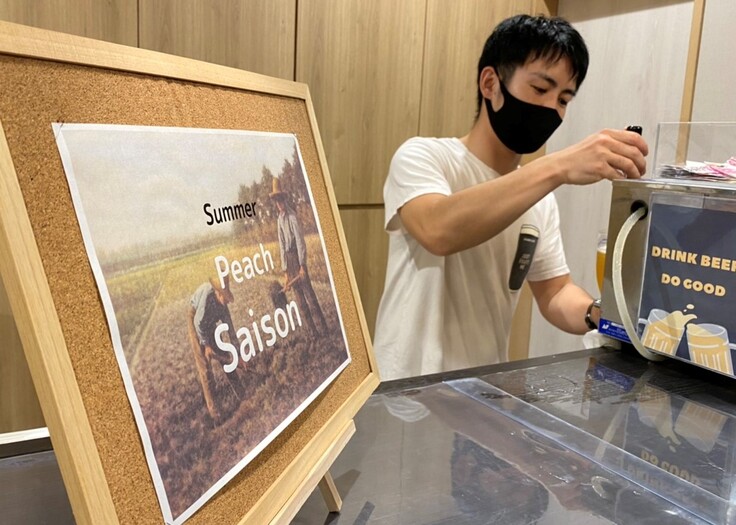 霧島隼人産「朝日の桃」を使ったビールの提供風景(場所:アイライクホテル)