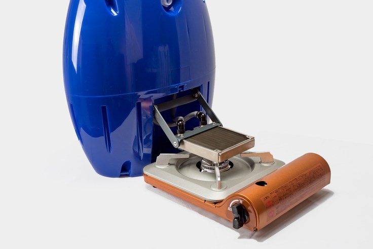 ●コンビニでも手に入るカセットガスを燃料とした移動式のガス湯沸かし器。