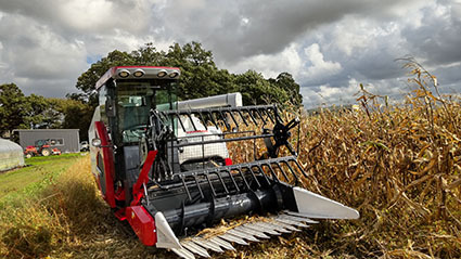 台風の影響や、その後の突然の雨もありましたが、11月2日(土)から導入した普通型コンバインを用いて子実用トウモロコシの収穫を始めています。