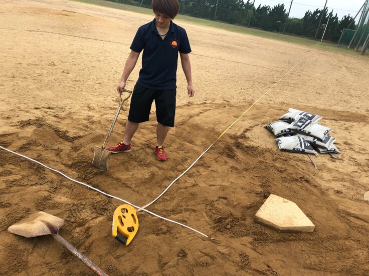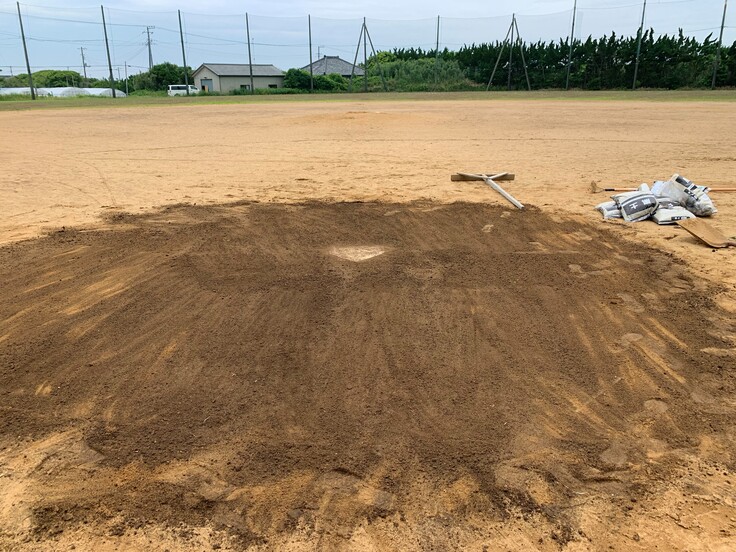 工程としては、まずホームベース付近から砂をかき出し、次に黒土と混ぜ合わせて踏み固め、最後に水を撒いて定着させました。