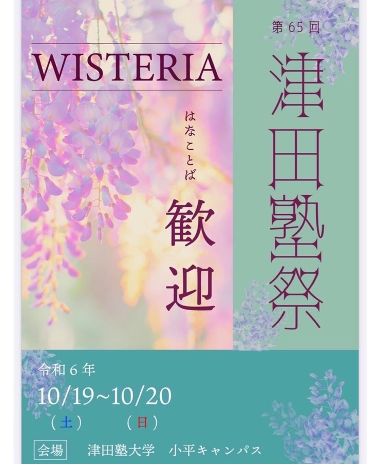 津田塾祭は、自然豊かで穏やかな小平キャンパスを周りの木々まで熱く盛り上げる年に一度の学園祭になります。今年度は、津田塾大学の創設者である津田梅子がデザインされた新5000円札の発行記念の意や、「歓迎」という意をこめて「Wisteria」をメインテーマといたしまいた。「Wisteria」の和名「藤の花」をテーマにメインポスターをご用意しております。