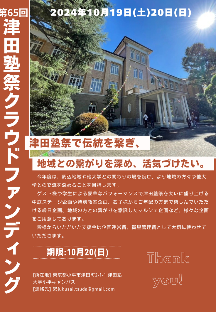今年度は、昨年度からさらにコロナの規制が緩和していることを踏まえ、さらに『地域・他大学とのつながり』を深めていきたいという目標があります。 昨年度は地域全体を巻き込んだスタンプラリーやフリーマーケットなどを通して地域の方との交流の場を設けることができました。今年度はより多くの地域・団体の方にご協力いただき、さらに老若男女問わず楽しめる企画を作り上げました。 また、他大学と連携した企画である動画企画やSNS企画を実施いたしました。これらの企画の運営費用を確保するためにクラウドファンディングを立ち上げさせていただきました。 さらに、今年度は衛生管理を徹底した上での調理が可能になったことにより、衛生管理費用が多くかかります。 しかし、委員会の予算ではこれらの費用を十分に確保できていないことが現状です。津田塾祭に関わるすべての人の安全をしっかり確保した上で、有意義な時間を過ごせる津田塾祭を作り上げていきたいと考えております。 今回のクラウドファンディングでいただいた資金は今年度の資金のみならず、次年度以降、より良い津田塾祭を作り上げるための運営資金としても活用させて頂きます。