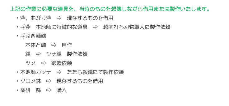 朝倉椀製作にあたっては現代の便利な道具は使わず、できるかぎり当時の道具を検証し再現して使用いたします。その道具類の準備は漸次進めているところです。
