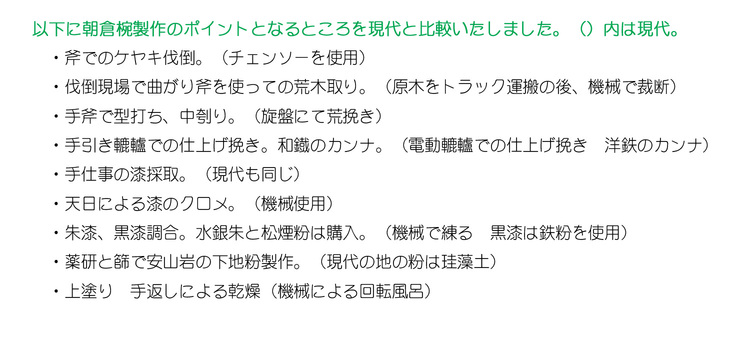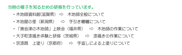 どんどん便利になっていく社会の中で、これからも漆器製作の環境はどんどん変化していくはずです。未来のものづくりを担う若い職人たちが、自分たちの足元の漆器づくりの歴史を遡って、不便な時代の漆器づくりを経験してみることは、かけがえのない財産になると確信しています。