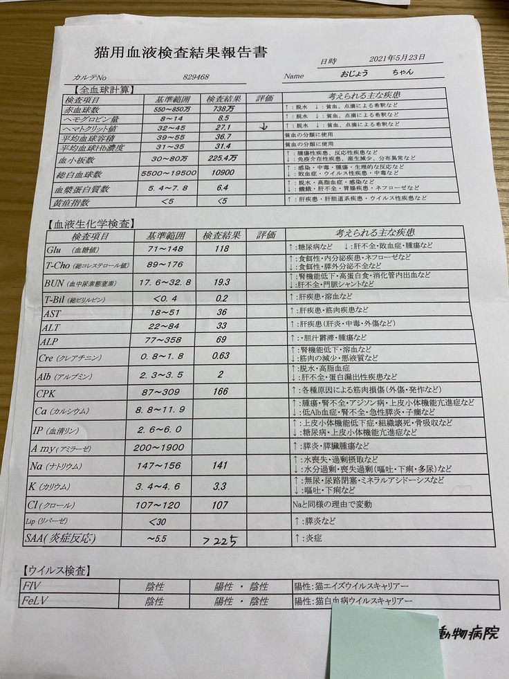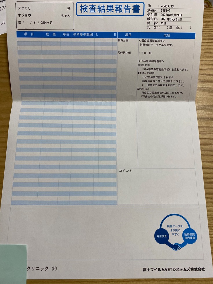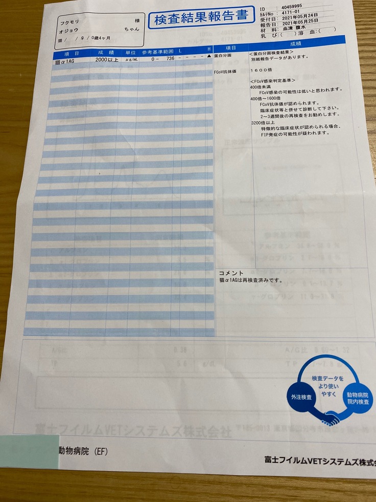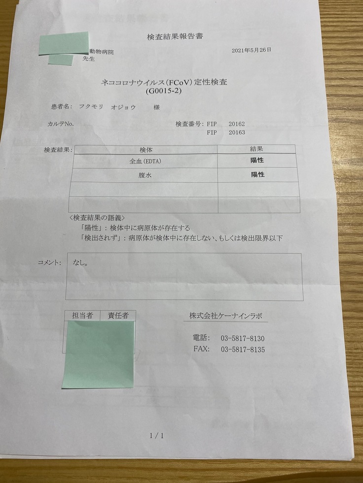 医師からは腹水が溜まっていてFIPの可能性がかなり高く長生きが難しいと説明を受けました。私も以前からFIPについて知っており必ず死んでしまうという認識があったためもう助からないと思いました。かなりショックで涙も止まりませんでした。