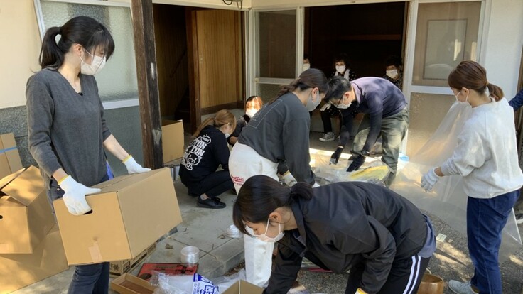 今回改修を行う空き家には、5年前まで生活しておられた生活用品がそのまま残されていました。まずは、この残置物の撤去から始めました。地域住民、学生が一緒に作業を行い約7.7トンの残置物を処分しました。