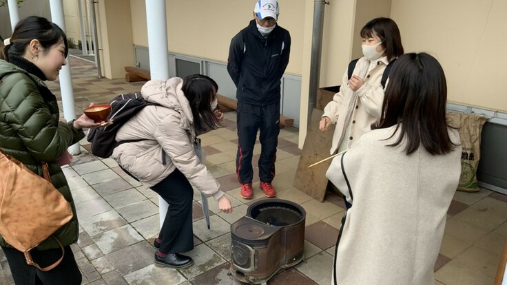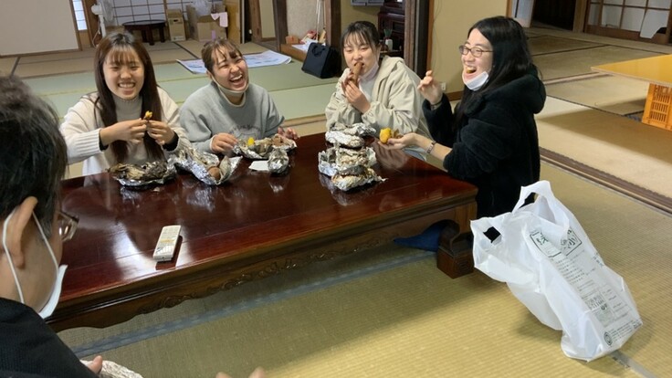 シェアハウス整備をきっかけに地域住民と学生の連携が進むように、住民、学生が参加する連携イベントを企画しました。住民の皆様に「焼き芋」や「燻製」「猪汁」などを用意していただき、楽しい時間を過ごしました。参加した学生も住民の皆様のあたたかさを感じてくれたようです。