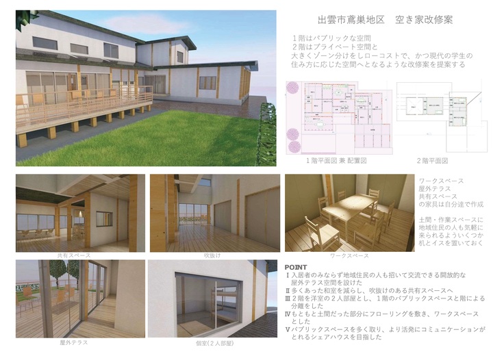 計画では大きな空き家全体を改修するのではなく、シェアハウスとして必要な部分のみを改修することで改修費を削減したり、地域住民や学生が一緒にDIY形式で改修工事にかかわることで費用の削減をしたり、改修工事をとおして地・学の連携をさらに進めていきます。