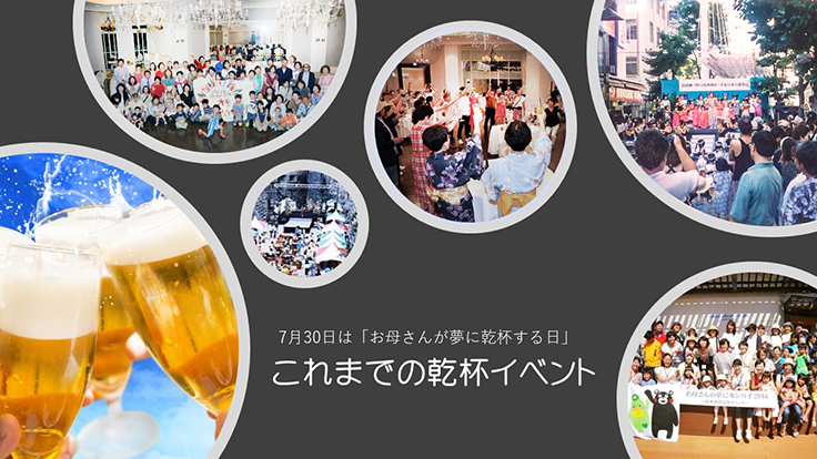 「年に一度、自分で自分にごほうびを。お母さんも、夢を描こう!」そんなコンセプトで始まった「お母さんの夢に乾杯企画」。毎年7月30日には「乾杯イベント」を開催。目的は、日本中のお母さんがつながって、お母さんである喜びを共感し合うこと。