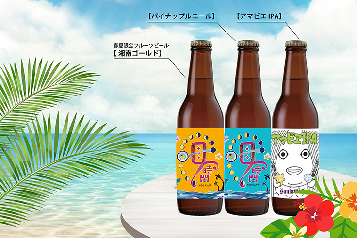 希少なオレンジ「湘南ゴールド」を絞ったフルーティーなビールと、常夏のハワイの香りがするゴールデンパインを絞ったジューシーなパイナップルエール。そして、岩本さん自身がコロナ対策や医療従事者への支援を目的につくった「アマビエビールIPA」という、3種類のテイストです。