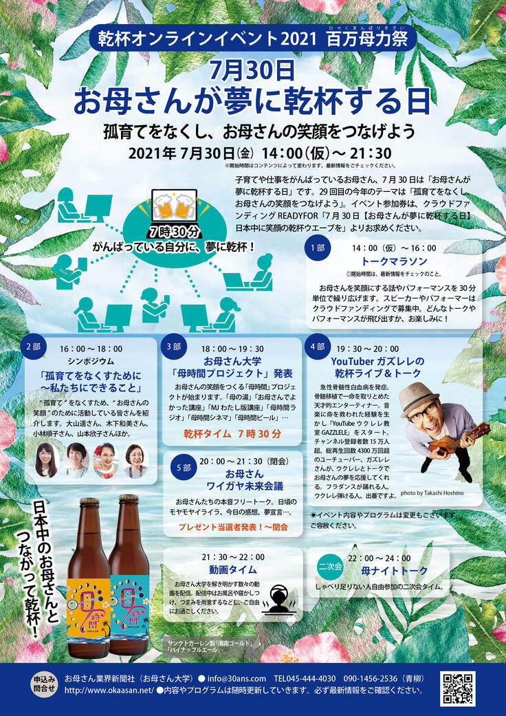 年中無休でがんばっている日本中のお母さん、7月30日は「お母さんが夢に乾杯する日」です。7時30分、心を一つに乾杯!「お母さんでよかった。また明日からがんばろう」と思える瞬間です。お母さん大学が毎年呼びかけている、お母さんのための乾杯企画。コロナ禍だからこそ、1人でも多くのお母さんとつながりたい。