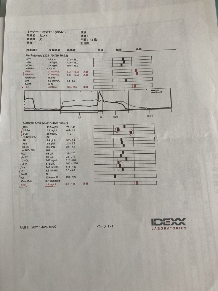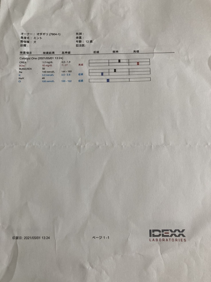 薬の影響で、ミントくんは正常値が20前後である尿素窒素の値が60、正常値が1.0前後のクレアチニンの値は2.8にまで上昇しました。